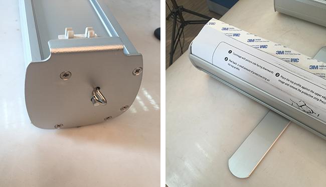 - Пружина барабана мобильного стенда подматывает и натягивает полотно.