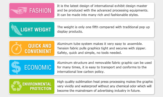 This counter is a great addition to any trade show presentation. The custom signage goes through a dye-sublimation printing process on high stretch fabric. The resolution is 720 DPI, which results in a brightly colored and detailed exhibit. The stretchy material eliminates wrinkles when pulled taut. This counter is constructed from an aluminum tube that sets up with a snap of a button.