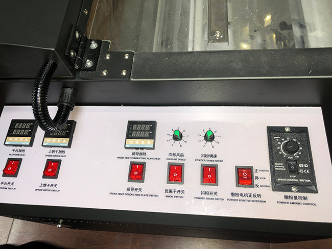 3. Посыпать порошком, встряхнуть порошок, нагревая ПЭТ-пленку.